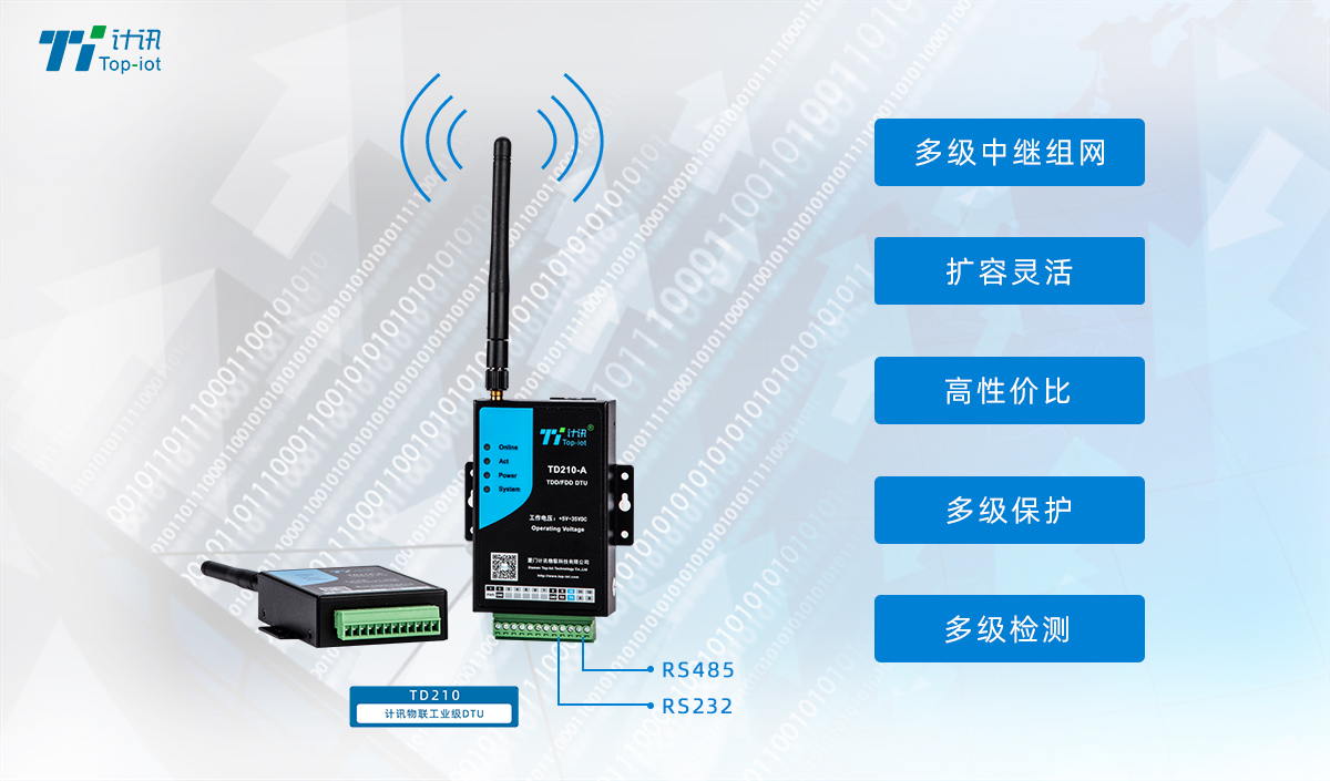 4G无线DTU TD210,支持全网通4G网络,工业级32位通信处理器,看门狗、心跳链路监测机制保证设备在线,标准SMA阴头天线接口,特性阻抗50欧,运行稳定可靠。
