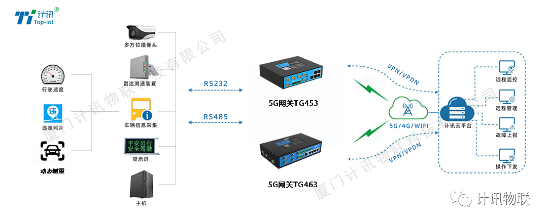 计讯物联5G工业网关基于5G移动网络的大带宽、低时延与高可靠性,搭配专有阻抗匹配电路设计与高增益优质天线,可保障通信安全稳定运行。同时,此5G网关系列产品兼具多种接入串口,可实时精准采集被检测车辆的车牌信息、车辆长宽高、车辆颜色。车轴数、重量以及是否超载超限等数据信息,实现对货运车辆全天候、不停车、不减速的超载或超限监测,严厉打击货运车严重超限超载违法行为。