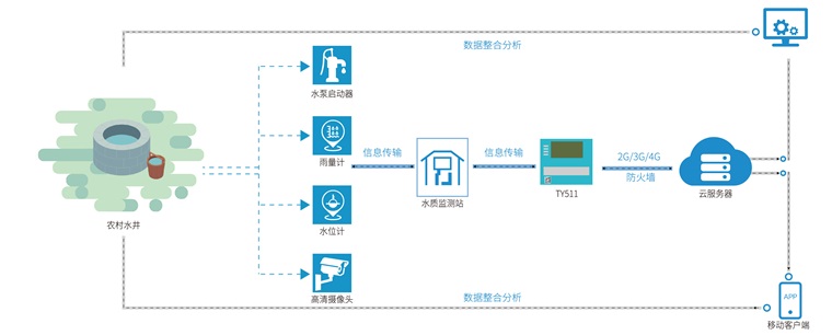 农村饮用水安全方案由前端数据采集与控制、无线数据传输以及后端监控及分析系统等其他设备或系统组成。