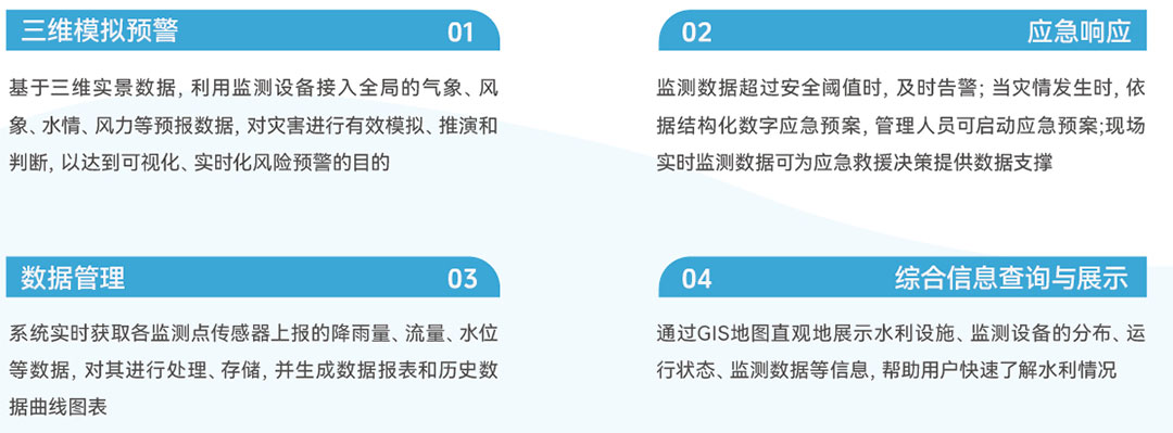 1. 数据采集层:通过部署水位计、流速仪、雨量传感器、水质监测设备、遥测终端机、GNSS接收机等,实时采集河流、水库、城市管网等关键区域的水文数据,并结合气象卫星、雷达数据,通过遥测终端机、GNSS接收机等数据采集传输终端,实现数据汇聚传输上云,形成多源数据融合。